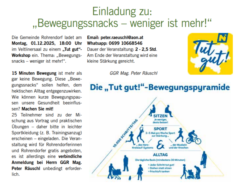 25 Teilnehmer sind zu der Mischung aus Vortrag und praktischen Übungen – daher bitte in leichter Sportkleidung (z. B. Trainingsanzug) erscheinen – eingeladen. Die Veranstaltung wird für Rohrendorferinnen und Rohrendorfer gratis angeboten, es ist allerdings eine verbindliche Anmeldung bei Herrn GGR Mag. Peter Räuschl (Email: peter.raeuschl(at)aon.at; Whatsapp: 0699 10668546) unbedingt erforderlich.