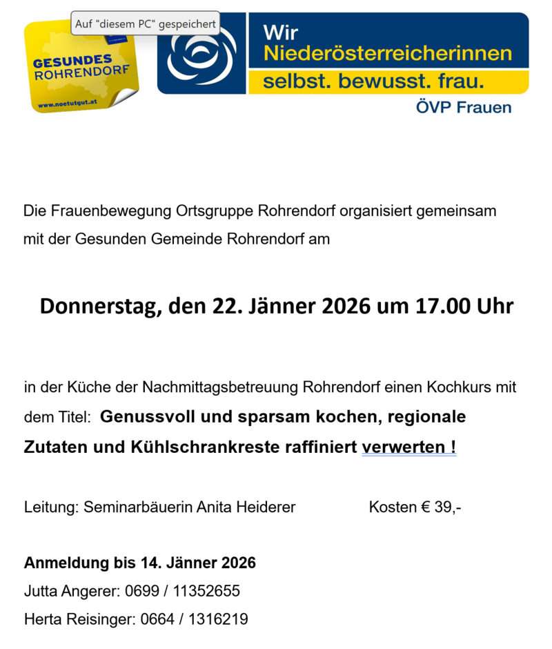 Die Frauenbewegung Ortsgruppe Rohrendorf organisiert gemeinsam mit der Gesunden Gemeinde Rohrendorf am 22. Jänner 2026 um 17.00 Uhr einen Kochkurs in der Küche der Nachmittagsbetreuung.