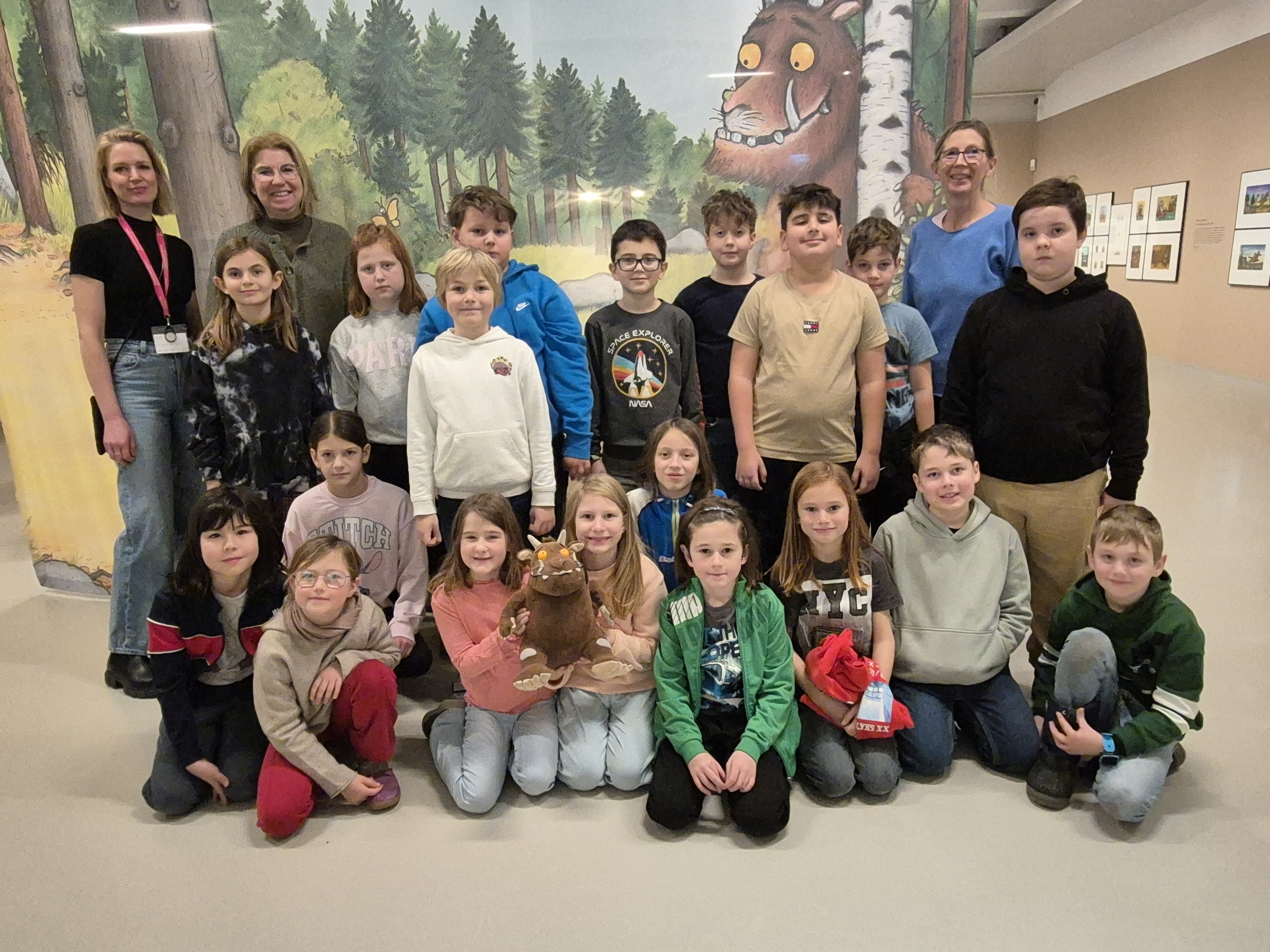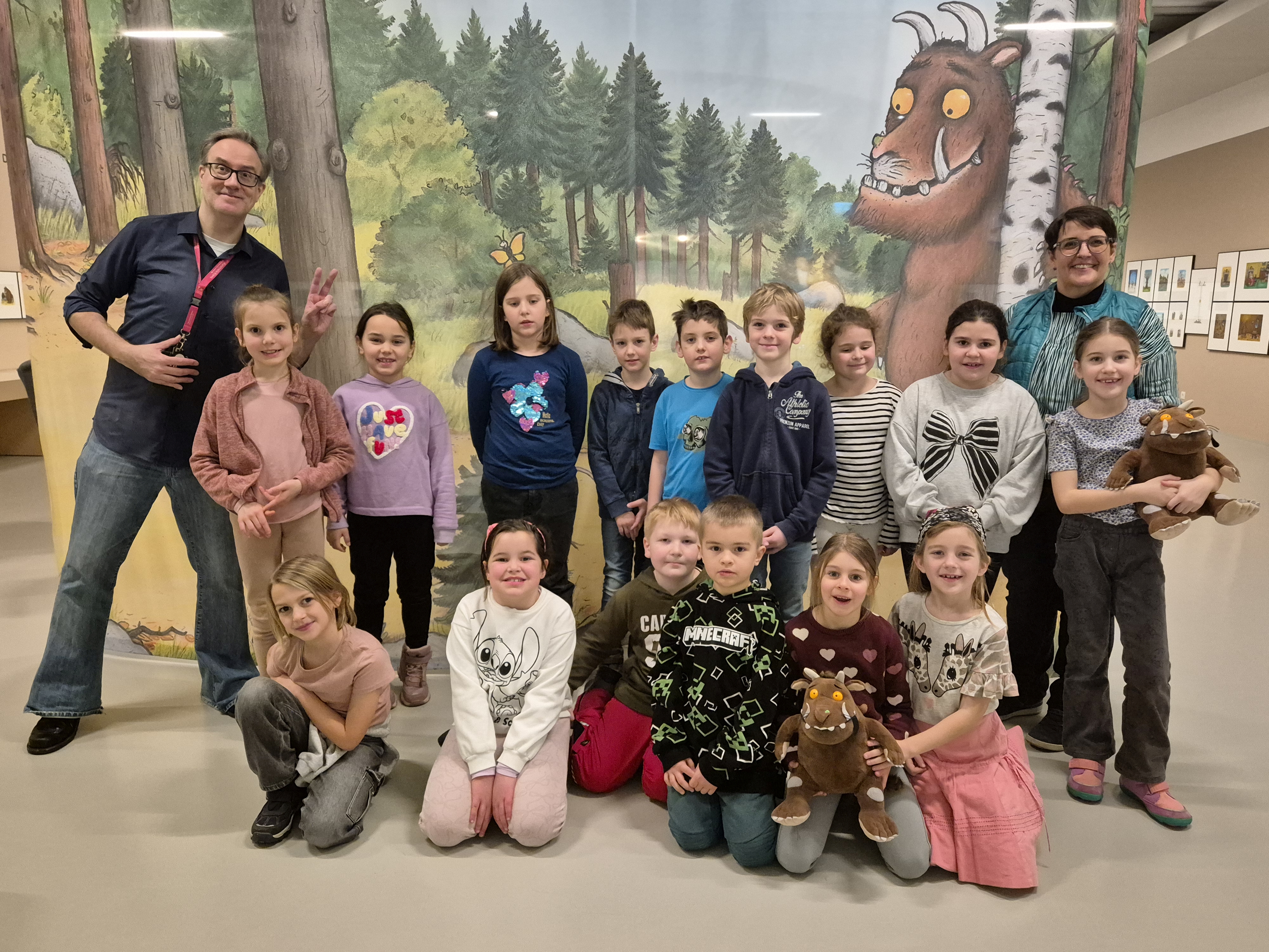 Die Kinder der 2. und 3. Klasse besuchten die bunte „Grüffelo“-Ausstellung im Karikaturmuseum Krems. Schon beim Ankommen war die Aufregung groß, denn im Museum warteten viele bekannte Figuren aus den beliebten Bilderbüchern auf sie.